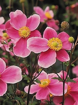 Анемона гибридная Хадспен Эбанденс: очень эффектный обильноцветущий сорт, цветки пурпурно-розовые ( 2-3 лепестка темнее), цветоносы сильно разветвлённые.