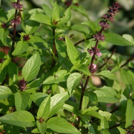 Базилик Licorice - среднерослое ветвистое растение. Листья глянцевые, яйцевидные, с острыми кончиком, слегка изогнутые, ярко-зеленого цвета. Побеги темно-бордовые, цветки фиолетовые. Аромат приятный. Страна-поставщик - Нидерланды.