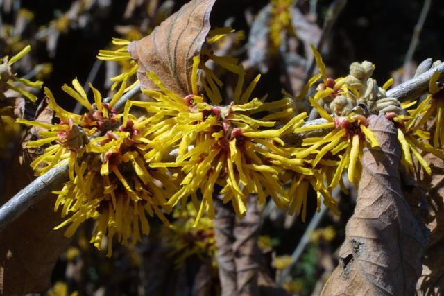 Гамамелис (волшебный орех) Ripe Corn - листопадный кустарник. Сорт среднего размера, достигающий 10-12 м, высокий и широкий. Лепестки яркие, ясно желтого цвета. Листья очередные, простые, средне-зеленые, летом становятся масляно-желтыми.