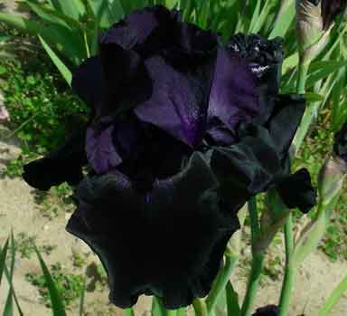 Рассада ириса Самбука Sambuka – очень интересный сорт высокорослых ирисов, впрочем, как и все сорта черной расцветки. Верхние доли (стандарты) Иссиня-черные, с некоторым темно-фиолетовым оттенком. Нижние доли (фолы) – угольно-черные по всей поверхности. Лепестки атласные, блестящие, переливающиеся на солнце. Бородка – темная, черно-фиолетовая, практически не заметная на общем фоне. Цветоносы высокие. Один из наиболее черных сортов.
