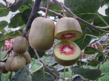Киви Hongyang - сорт позднего созревания. Мякоть желто-зеленая, но из сердцевины плода излучается темно-красный цвет, что создает особенно привлекательный контраст цветов. Вокруг серцевины находятся маленькие черные семена. Форма плода - циллиндричная эллиптическая, окрас серый с коричнево-зеным оттенком. Фрукт сладкий с приятным ароматом. Вес - 70-120 грамм.