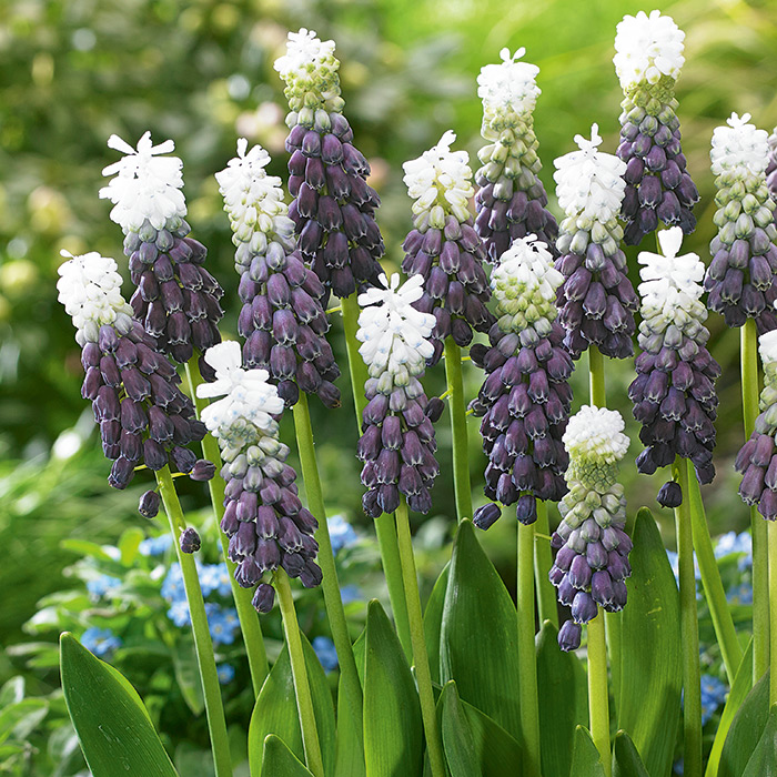 Мускари широколистный Грейп Айс – растение очень напоминает миниатюрные гиацинты: их безлистные цветоносы увенчаны плотными кистевидными соцветиями, собранными из крохотных колокольчиков. Высота растения 25 см. Уникальная трехцветная окраска! Сине-фиолетовый, почти черный низ плавно переходит в светло-зеленый тон, верхушка - лилово-белая. Цветение обычно начинается в апреле-мае и продолжается до 4 недель. Мускари широколистный Грейп Айс любят солнечные, открытые места, рыхлую, легкую почву с хорошей водопроницаемостью. Нельзя высаживать на пониженных участках, так как мускари не выносят продолжительного застоя воды.