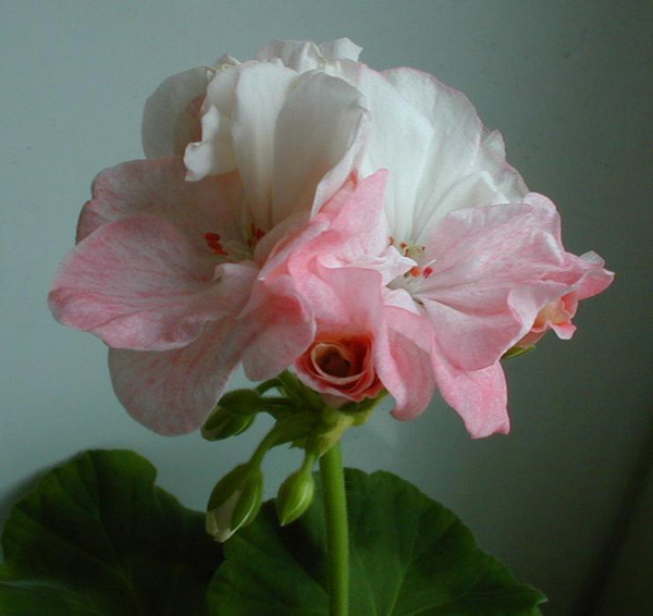 Пеларгония Joy - красивоцветущий нежный кустарник. Листья зеленые, с более светлой зоной в центре листа и более темные по краям. Цветки среднемахровые, кремово-белые с кремово-розовой каймой лепестков, собранные в крупные шапки-соцветия.
