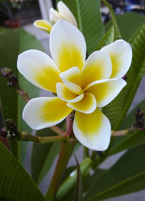 Plumeria Bali Whirl отличается легким цитрусовым ароматом цветков. Цветки двойные, 9-10-лепестковые, средних размеров. Лепестки продолговатые, желто-белого окраса. Листья очень большие. Деревце средне-компактное.