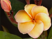 Plumeria Orange Sapphire - крупноцветковый сорт. Лепестки округлой формы, большие, кремово-розовые с желтой серединкой и оранжевым основанием, слегка перекрывают друг друга. Цветки обладают ярко выраженным ароматом жасмина.