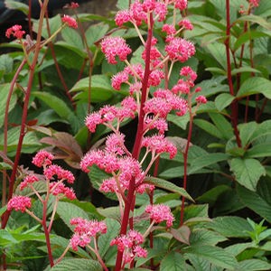 Роджерсия Bronze Peacock - декоративный кустарник. Листья глубоко- бронзово- бурые, толстые, густые, блестящие, сильно рассеченые. Весной, в огромных бронзовых листьях появляются розовые соцветия, как павлиний хвост. Одинаково темные соцветия держатся долго и эффектно. Сорт предпочитает влажную почву.