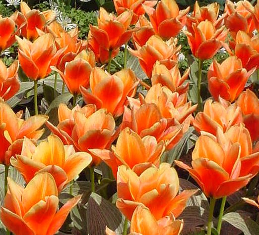 Тюльпан Calypso - крупный цветок насыщенного желтовато-розового цвета, с персиковым оттенком по краям лепестка. К концу цветения окраска становится насыщенней. Декоративные плотные листья с бордово-фиолетовыми штрихами на дымчато-зеленом фоне. Высота растения 15-30 см. Цветет сорт в апреле-мае. Зимостойкий.