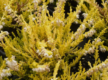 Вереск обыкновенный сорта Gold Haze – многолетний вечнозеленый кустарник с широкой компактной кроной ажурного вида, который характеризуется невысокой скоростью роста, но достаточно высокий среди семейства вересковых. Иногда достигает в высоту 70 см. Листья игольчатые, золотисто-желтого цвета. Цветы этого сорта красивые, белого цвета, расположенные на растущих вертикально соцветиях. Длина соцветий достигает двадцати сантиметров. Цветами радует с начала августа до наступления осени. По окончании периода заморозков рекомендуется делать обрезку куста.Любит умеренно увлажненную, обогащенную почву.Морозоустойчив, но поздние весенние заморозки могут нанести вред кустарнику.Светолюбив и будет пышно цвести на участках с хорошим доступом солнечного света. Может расти и на притененных территориях.