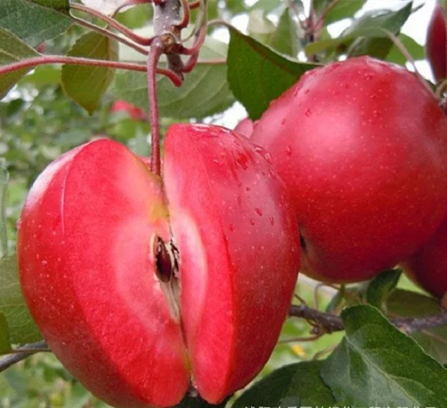 Примечательным являются и яблоки данного сорта. Они правильной, плоскоокруглой формы, большого размера. Вес яблока может достигать 200 грамм. Яркий малиновый покровный оттенок переходит в сочную розового-красную плотную мякоть. Оценки дегустации ещё нет, но вкусовые качества отмечены довольно высокие и даже легкая терпкость ни капли их не портит. А вот аромат плодов невероятно стойкий похож на запах лесных ягод. Из фруктов дальше делаю сок который немного напоминают по вкусу клюквенный