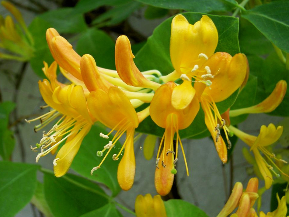 Крупномер Жимолость вьющаяся Тельмана Lonicera tellmanniana имеет красивые продолговатой формы листья, сизые снизу и ярко-зеленые сверху. Пара верхних листочков сросшиеся под соцветием. Оранжево-золотистые цветочки растут 6 см в длину, а самый пик их обильного цветения – июнь. Цветет он не долго, всего пару недель, и ягодки потом не появляются.Саженец любит влажные солнечные или полузатененные места, с богатым гумусом и хорошим дренажем почвой.